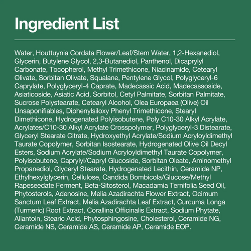 INGREDIENTS: Water, Houttuynia Cordata Flower/Leaf/Stem Water, 1,2-Hexanediol, Glycerin, Butylene Glycol, 2,3-Butanediol, Panthenol, Dicaprylyl Carbonate, Tocopherol, Methyl Trimethicone, Niacinamide, Cetearyl Olivate, Sorbitan Olivate, Squalane, Pentylene Glycol, Polyglyceryl-6 Caprylate, Polyglyceryl-4 Caprate, Madecassic Acid, Madecassoside, Asiaticoside, Asiatic Acid, Sorbitol, Cetyl Palmitate, Sorbitan Palmitate, Sucrose Polystearate, Cetearyl Alcohol, Olea Europaea (Olive) Oil Unsaponifiables, Diphenylsiloxy Phenyl Trimethicone, Stearyl Dimethicone, Hydrogenated Polyisobutene, Poly C10-30 Alkyl Acrylate, Acrylates/C10-30 Alkyl Acrylate Crosspolymer, Polyglyceryl-3 Distearate, Glyceryl Stearate Citrate, Hydroxyethyl Acrylate/Sodium Acryloyldimethyl Taurate Copolymer, Sorbitan Isostearate, Hydrogenated Olive Oil Decyl Esters, Sodium Acrylate/Sodium Acryloyldimethyl Taurate Copolymer, Polyisobutene, Caprylyl/Capryl Glucoside, Sorbitan Oleate, Aminomethyl Propanediol, Glyceryl Stearate, Hydrogenated Lecithin, Ceramide NP, Ethylhexylglycerin, Cellulose, Candida Bombicola/Glucose/Methyl Rapeseedate Ferment, Beta-Sitosterol, Macadamia Ternifolia Seed Oil, Phytosterols, Adenosine, Melia Azadirachta Flower Extract, Ocimum Sanctum Leaf Extract, Melia Azadirachta Leaf Extract, Curcuma Longa (Turmeric) Root Extract, Corallina Officinalis Extract, Sodium Phytate, Allantoin, Stearic Acid, Phytosphingosine, Cholesterol, Ceramide NG, Ceramide NS, Ceramide AS, Ceramide AP, Ceramide EOP.