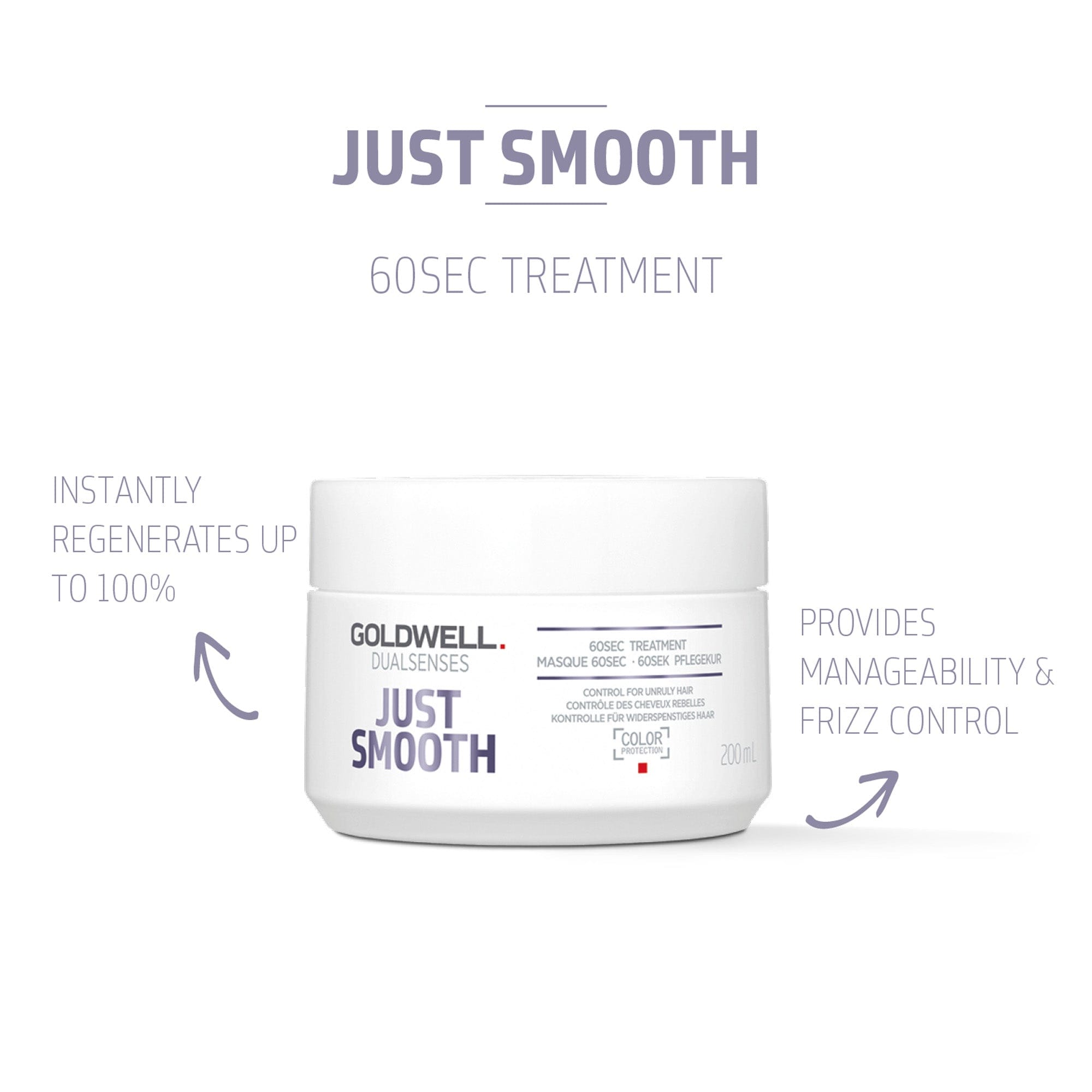 Goldwell Dualsenses Just Smooth Treatment instantly regenerates unruly hair in 60 seconds, providing manageability and frizz control. Perfect for those with unruly hair looking for quick and easy hair care.