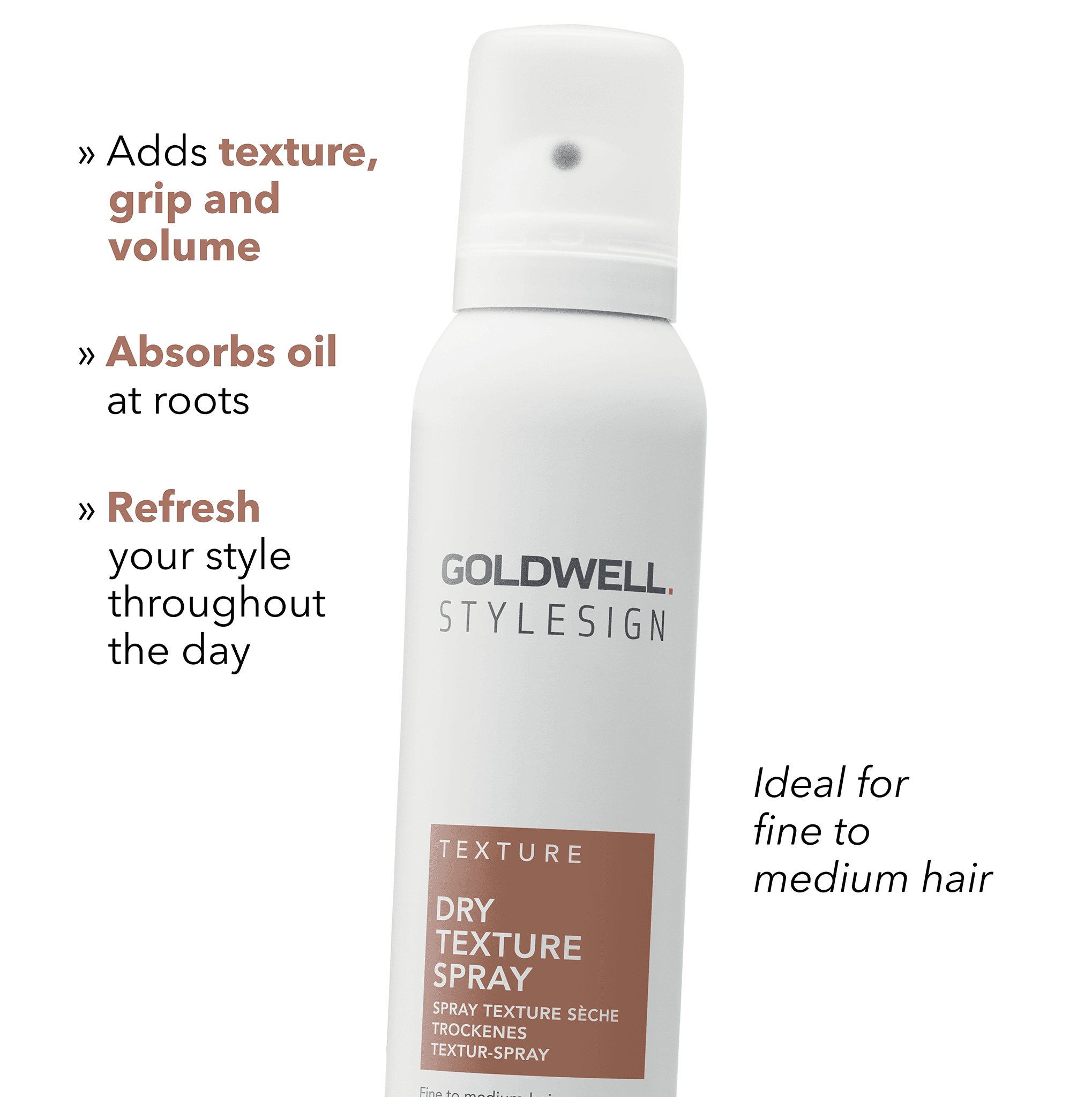 Goldwell StyleSign Dry Texture Spray: instant texture, matte finish, volume, flexible hold. Ideal for easy restyling, effortless style. Ideal for volume and texture seekers.