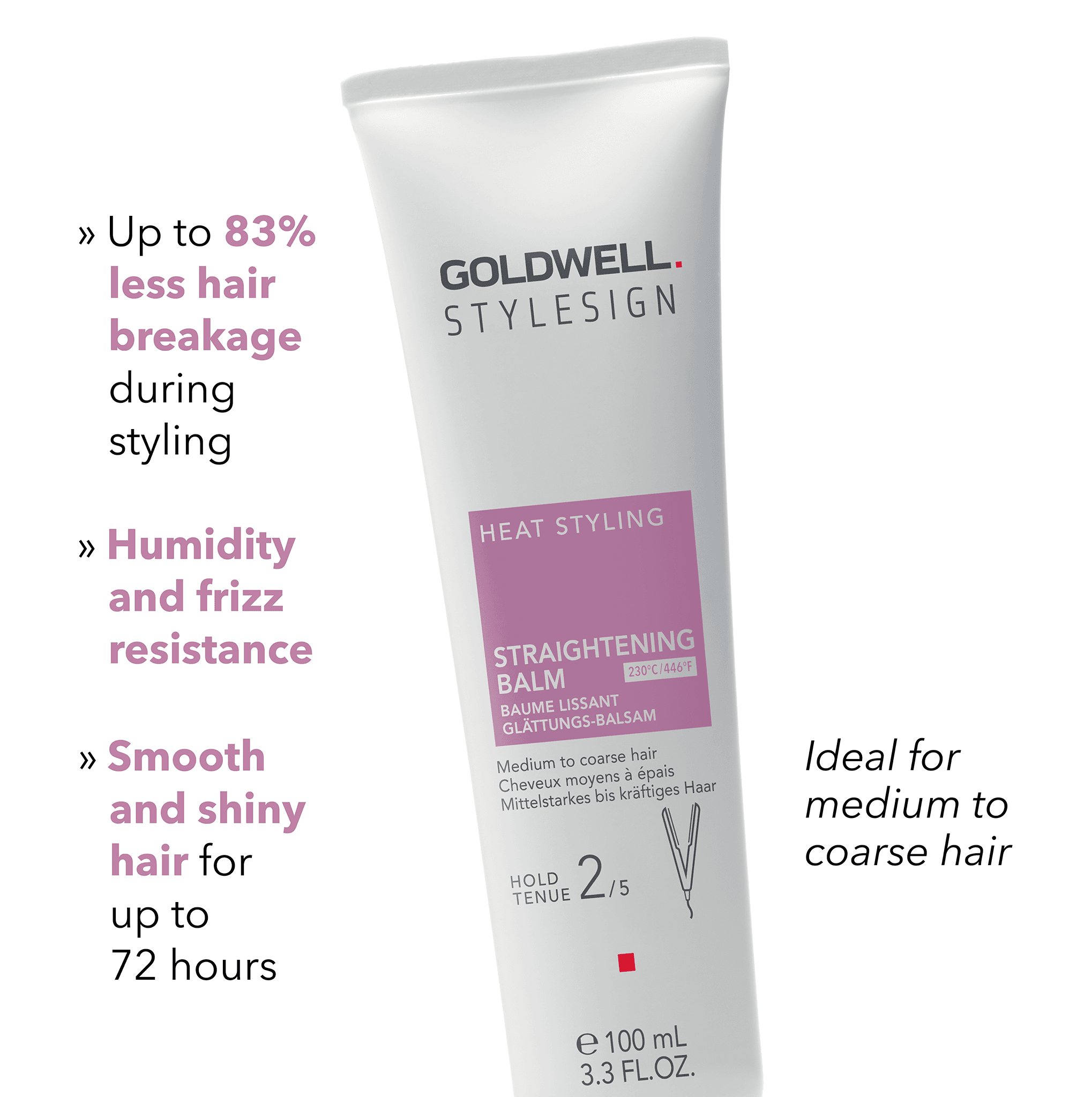 Goldwell StyleSign Straightening Balm 100ml offers long-lasting straightness, heat protection, reduces frizz, leaving hair soft and shiny. Ideal for curly or wavy hair seeking a sleek look without daily styling.