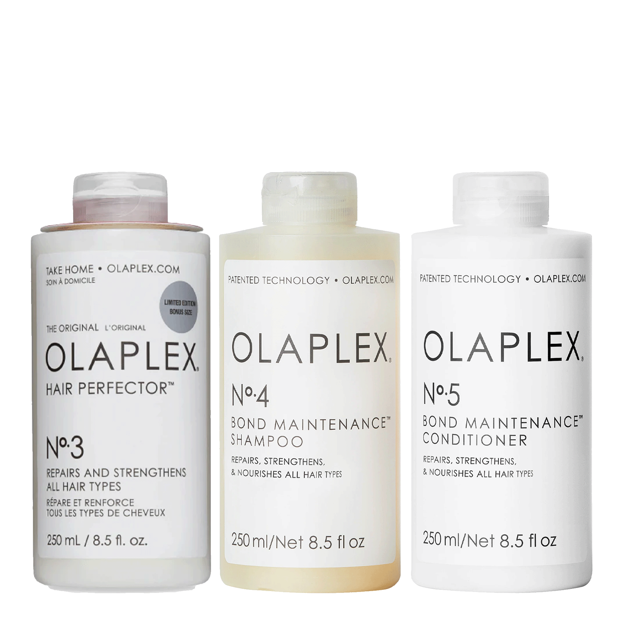 The Olaplex Bond Maintenance System is a three-step routine that includes a 250ml Nº.3 Hair Perfector, Nº.4 Bond Maintenance Shampoo, and Nº.5 Bond Maintenance Conditioner, all featuring OLAPLEX Bond Building Technology to repair damage and maintain visibly stronger, healthier hair.