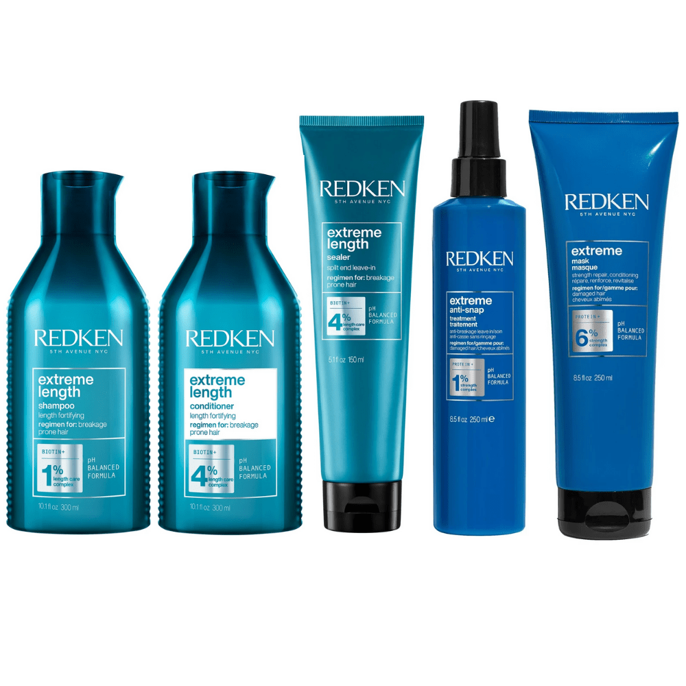 The Redken Longer and Stronger Bundle includes a range of haircare products designed to strengthen and promote hair growth, including shampoo, conditioner, leave-in treatment, sealer, and mask.
