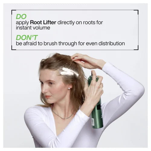 How to Use: How to use Redken Root Lifter 300g: Begin with clean, damp hair. Towel-dry your hair to remove excess moisture.Shake the Redken Root Lifter well before use to ensure the product is properly mixed.Hold the canister upright and dispense a small amount of the root lifter onto your fingertips.Apply the product directly to your roots, concentrating on the areas where you want to achieve maximum lift and volume.Use your fingers to gently massage the root lifter into your roots, lifting and fluffing as you go. This will help distribute the product evenly and create the desired lift.Blow-dry your hair using a round brush to further enhance the volume and lift at the roots.Proceed with your desired hairstyle, whether it’s a voluminous blowout, a chic updo, or a creative braided look.